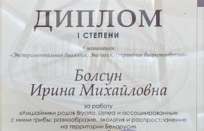 Магистрант 2 курса кафедры биологии Болсун Ирина достойно представила Гомельский государственный университет имени Франциска Скорины и получила диплом I степени в номинации «Экспериментальная биология. Экология, сохранение биоразнообразия» за работу «Лишайники родов Bryoria, Usnea и ассоциированные с ними грибы: разнообразие, экология и распространение на территории Беларуси».