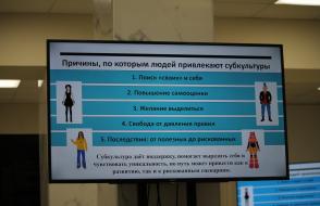На встрече был рассмотрен вопрос о молодежных субкультурах. Педагог-психолог отдела по идеологической и воспитательной работе Алина Куцанова представила информацию о современных субкультурных течениях, их влиянии на формирование личности студентов и возможных рисках, связанных с вовлечением молодежи в деструктивные сообщества.