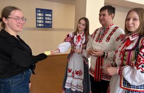 Сёння на філалагічным факультэце святкавалі Дзень роднай мовы. Студэнты ў нацыянальным адзенні віншавалі ўсіх са святам і прапаноўвалі перакласці словы з рускай мовы на беларускую студэнтам і выкладчыкам розных факультэтаў.