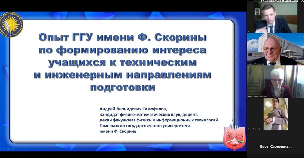 С докладом «Опыт ГГУ имени Ф. Скорины по формированию интереса учащихся к техническим и инженерным направлениям подготовки» выступил Андрей Самофалов – кандидат физико-математических наук, доцент, декан факультета физики и информационных технологий Гомельского государственного университета имени Ф.Скорины.