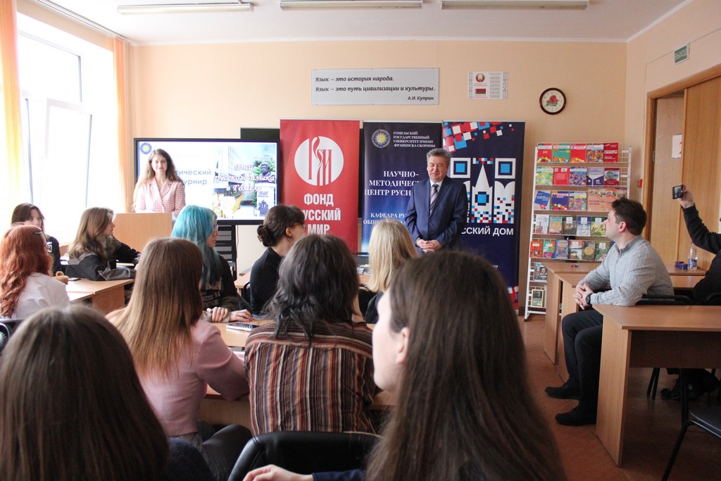 Затем С.А. Улитин посетил мероприятия программы «Дни русского языка» на филологическом факультете. Это был Лингвистический эрудит-турнир для школьников города Гомеля и области, а также Круглый стол «Языковое богатство русской и мировой культуры» с участием иностранных студентов.
