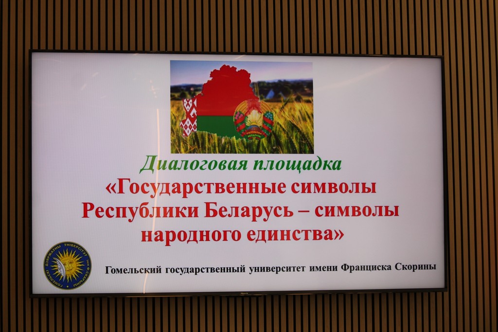 В Гомельском государственном университете имени Франциска Скорины состоялась диалоговая площадка, посвященная государственной символике Республики Беларусь. Мероприятие приурочено к празднованию Дня Государственного флага, Государственного герба и Государственного гимна Республики Беларусь. Этот значимый государственный праздник отмечается в нашей стране во второе воскресенье мая – 10 мая в этом году.