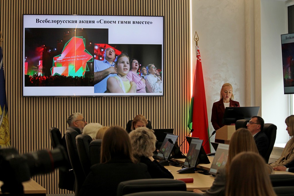 – Ангелина Грицкова, студентка 3 курса специальности «Лингвистическое обеспечение МКК» представила презентацию по теме «Ценности белорусского народа в государственной символике Республики Беларусь».