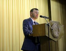 В актовом зале состоялась очередная встреча руководства университета с коллективом преподавателей, сотрудников и студентов факультета физической культуры, биологического и филологического факультетов. От лица ректората к присутствующим обратился первый проректор Андрей Крук.
