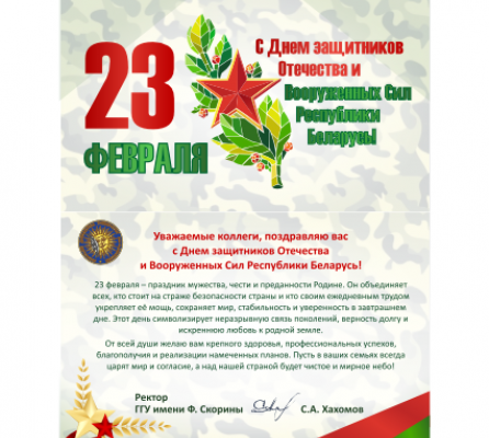 Уважаемые коллеги, поздравляю вас с Днем защитников Отечества и Вооруженных Сил Республики Беларусь! 23 февраля – праздник мужества, чести и преданности Родине. Он объединяет всех, кто стоит на страже безопасности страны и кто своим ежедневным трудом укрепляет её мощь, сохраняет мир, стабильность и уверенность в завтрашнем дне. Этот день…