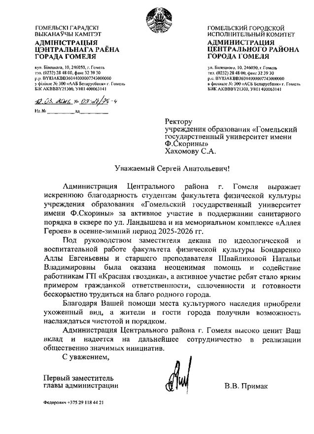 Благодарность за активное участие в благоустройстве мемориального комплекса "Аллея Героев" (Благодарность Шлайликовой Н.В., Бондаренко А.Е.)