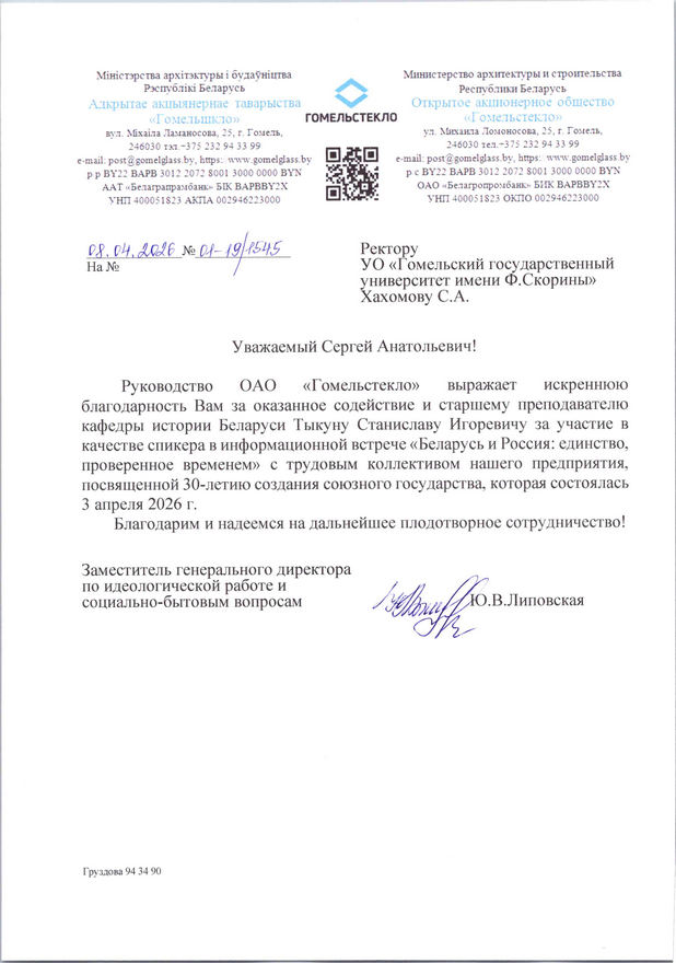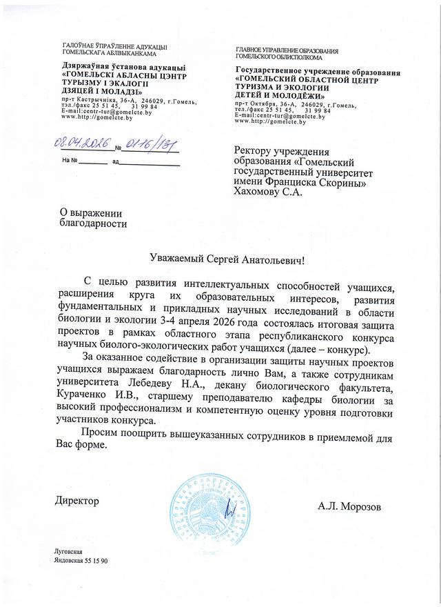 Благодарность Гомельского областного института развития образования