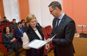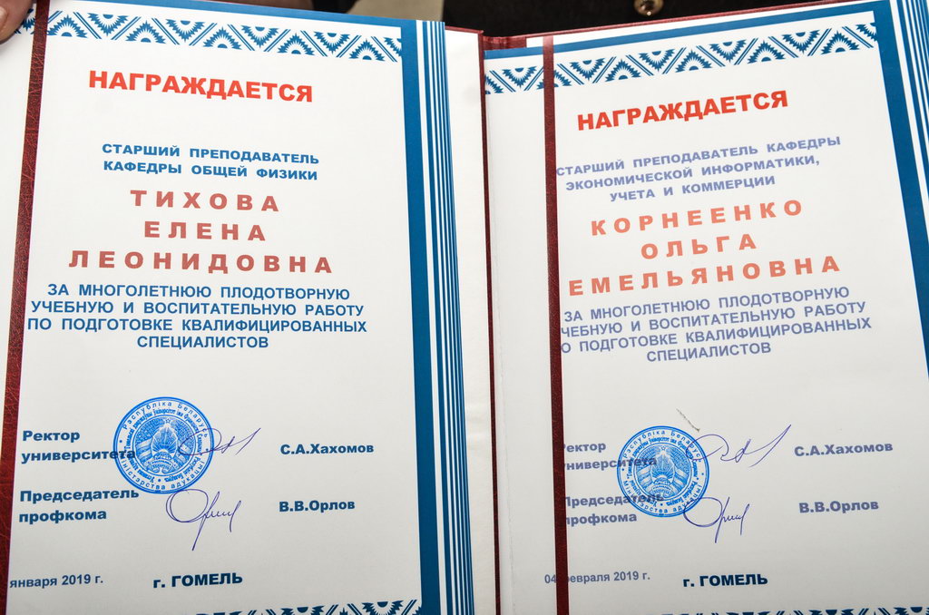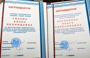 Ганаровыя граматы ГДУ імя Ф. Скарыны за шматгадовую плённую навучальную і выхаваўчую працу па падрыхтоўцы кваліфікаваных спецыялістаў былі ўручаны на Савеце ўніверсітэта старэйшаму выкладчыку кафедры агульнай фізікі Алене Леанідаўне Цiхавой і старэйшаму выкладчыку кафедры эканамічнай інфарматыкі, ўліку і камерцыі Вользе Емяльянаўне Карняенка.