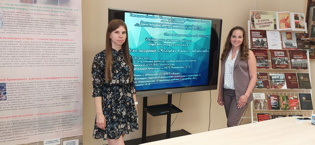 У рамках Дэкады моладзі і студэнцтва адбылося пашыранае пасяджэнне навуковага таварыства навучэнцаў каледжа па тэме “Моладзь у навуцы і творчасці”. У ім прынялі ўдзел студэнты 3 курса спецыяльнасці «Сацыяльная праца» факультэта псіхалогіі і педагогікі Слесарава А.С. і Сарокіна А.А.