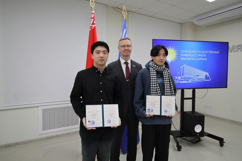 Today, the rector of the university, Sergey Khakhomov, awarded Bachelor's diplomas to 52 graduates from among the citizens of the People's Republic of China. The students studied at the Gomel State University under the experimental project "Implementation of the Model of Integration of the Educational Program and Higher Education Degree (Republic of Belarus) with the Educational Program of Non-University Higher Education (PRC) in a shortened timeframe."