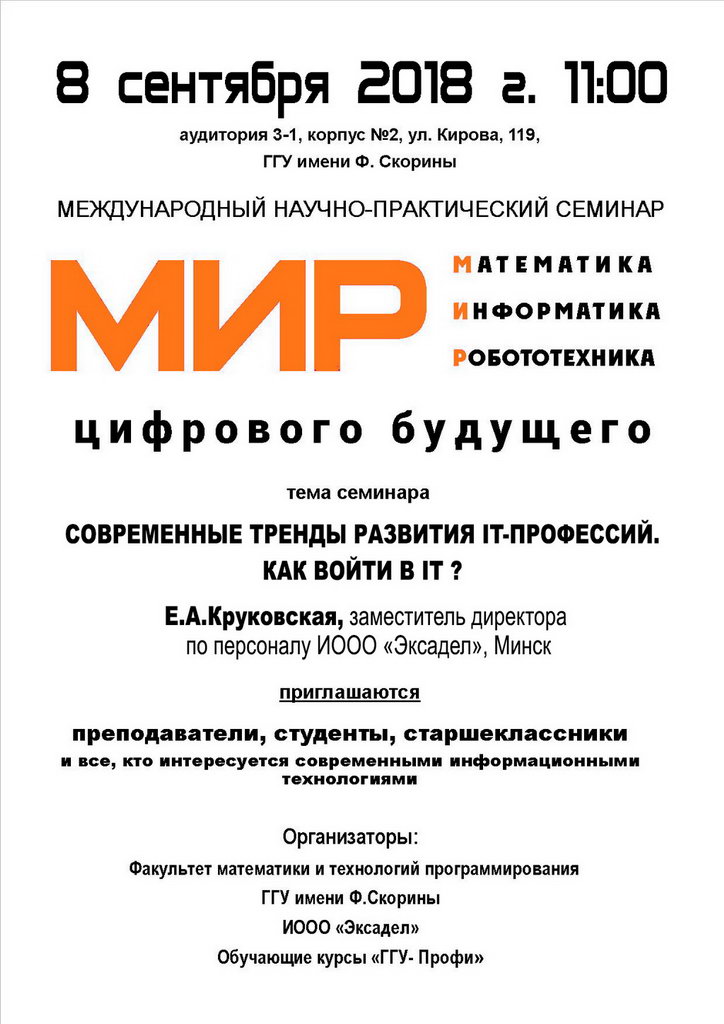 Организаторы проекта «МИР цифрового будущего» – факультеты математики и технологий программирования и физики и информационных технологий ГГУ имени Ф. Скорины совместно с компанией Exadel и обучающими курсами «ГГУ-Профи».