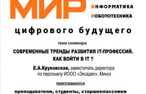 Первый в новом учебном году семинар состоится 8 сентября. Он сделает акцент на современных трендах развития IT-профессий и расскажет о том, с чего начать свой путь в индустрию информационных технологий, как действовать эффективно и достичь успеха. Экспертом открытой встречи выступит представитель компании Exadel Елена Круковская.