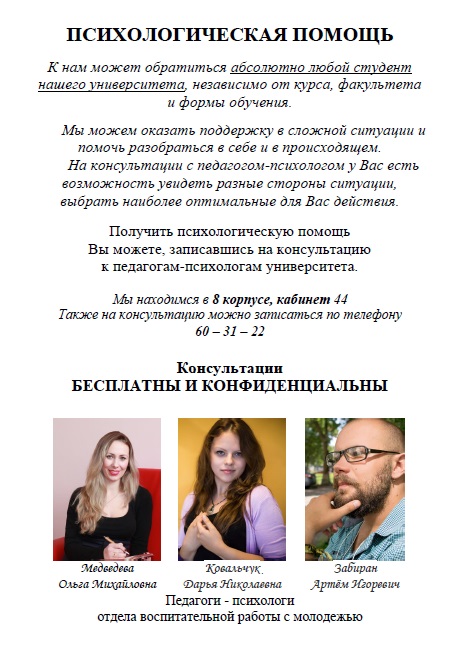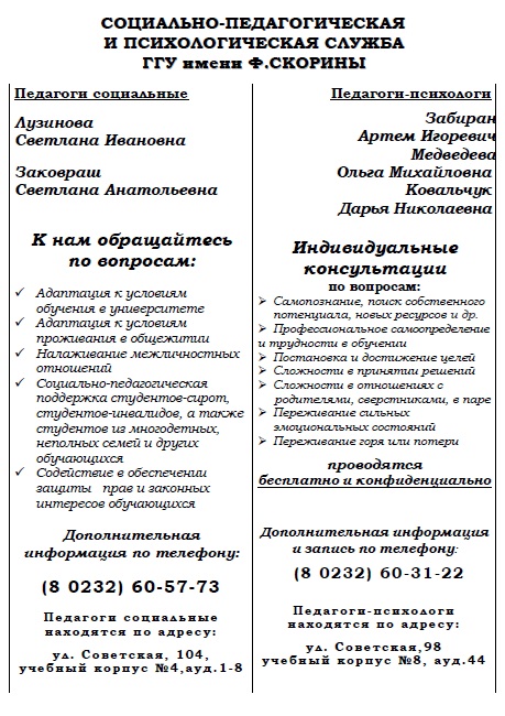 2 и 3 октября в актовом зале ГГУ имени Ф Скорины состоялись информационно-профилактические встречи с первокурсниками всех факультетов ГГУ имени Ф. Скорины. На мероприятиях присутствовал проректор по воспитательной работе Никитюк Юрий Валерьевич, председатель профсоюза Азявчиков Сергей Олегович, заместитель председателя профсоюза студентов Климова Татьяна Владимировна, инспектор инспекции по делам несовершеннолетних администрации Центрального района г. Гомеля, старший лейтенант милиции Карасева Ирина Владимировна, психолог психологического отделения учреждения «Гомельский областной наркологический диспансер» Сериков Алексей Вячеславович, инспектор инспекции по делам несовершеннолетних администрации Центрального района г.Гомеля, старший лейтенант милиции Судникович Веста Юрьевна, психолог психологического отделения учреждения «Гомельский областной наркологический диспансер»  Шелкович-Кураш Алёна Валентиновна.  В рамках встречи обсуждались вопросы, касающиеся профилактики правонарушений и зависимостей.