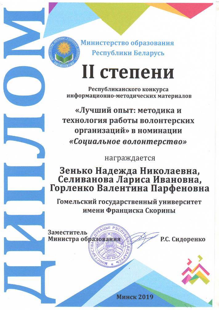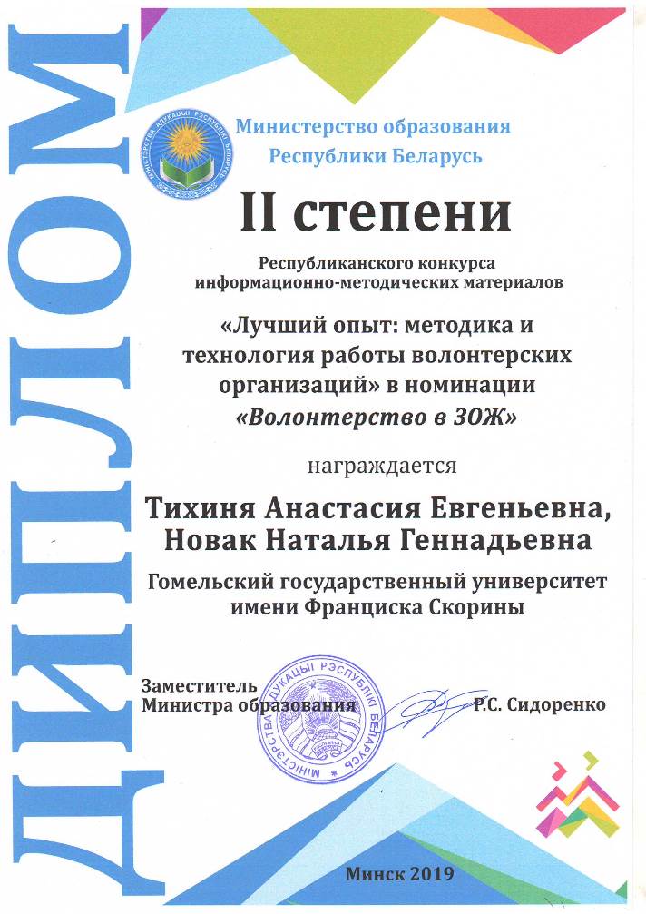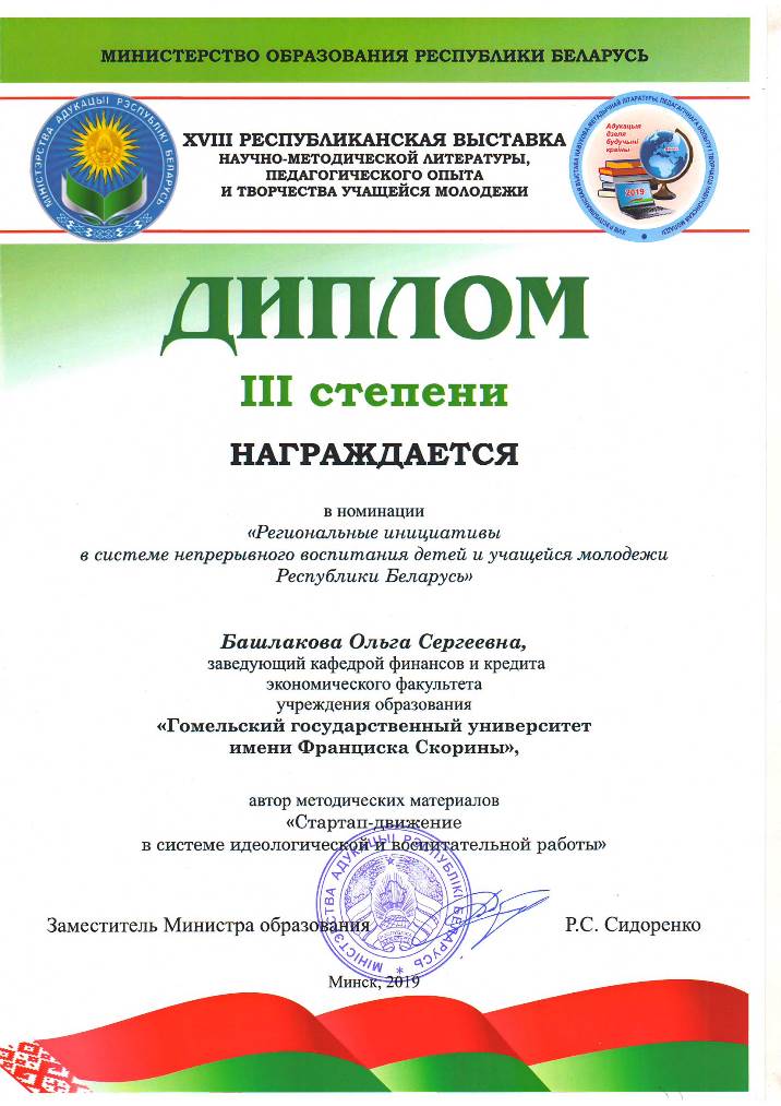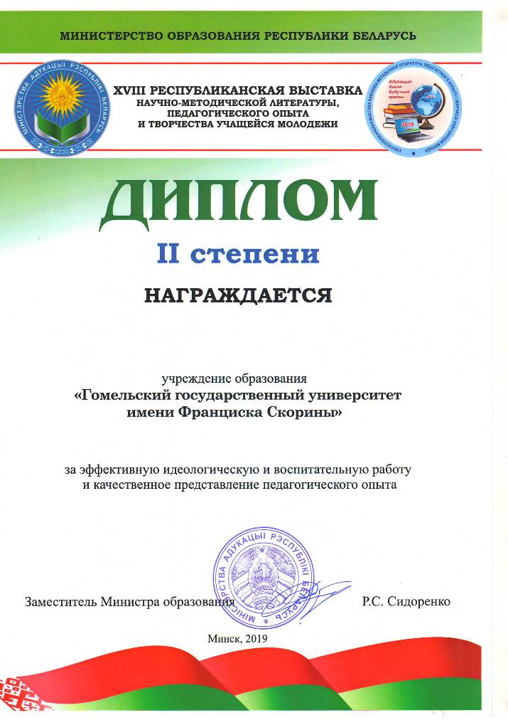 Проекты ГГУ имени Ф. Скорины получили высокую оценку организаторов. Диплом третьей степени Министерства образования в номинации «Региональные инициативы в системе непрерывного воспитания детей и учащейся молодежи Республики Беларусь» получил проект «Стартап движение в системе идеологической и воспитательной работы» Ольги Башлаковой. Дипломами второй степени Министерства образования награждены волонтерские отряды «Созвездие» и «ЗА здаровы лад жыцця» факультета психологии и педагогики. По итогам выставки ГГУ имени Ф. Скорины был отмечен дипломом второй степени за эффективную идеологическую и воспитательную работу и качественное представление педагогического опыта.