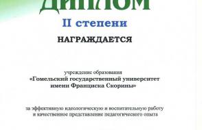 К участию в конкурсе методических разработок ГГУ имени Ф. Скорины представил материалы в 4-х номинациях: гражданско-патриотическое воспитание учащейся молодежи, формирование отношения к здоровому образу жизни как основополагающей жизненной ценности, инновации в системе воспитания учащейся молодежи и региональные инициативы в системе непрерывного воспитания детей и учащейся молодежи Республики Беларусь.