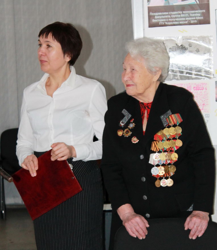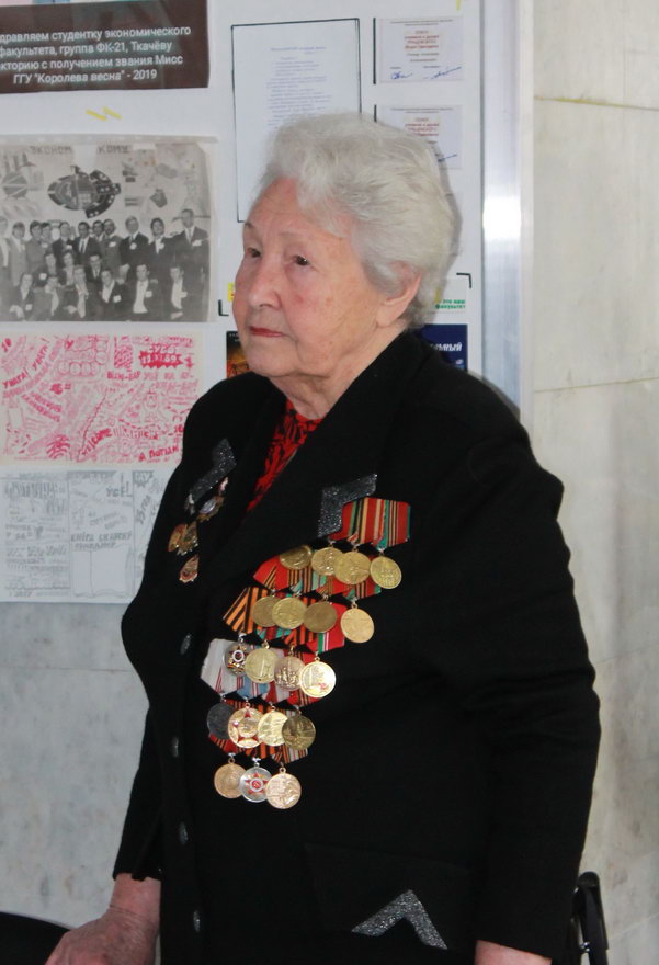 С приветственными словами к присутствующим обратился проректор по воспитательной работе Юрий Никитюк. Слова благодарности, уважения и почтительности прозвучали в адрес почетного гостя — ветерана Великой Отечественной войны Аэлиты Ивановны Самсоновой. Совсем девчонкой она трудилась для победы в тылу, а как позволил возраст, пошла медсестрой в госпиталь и дошла с ним до самого Берлина.