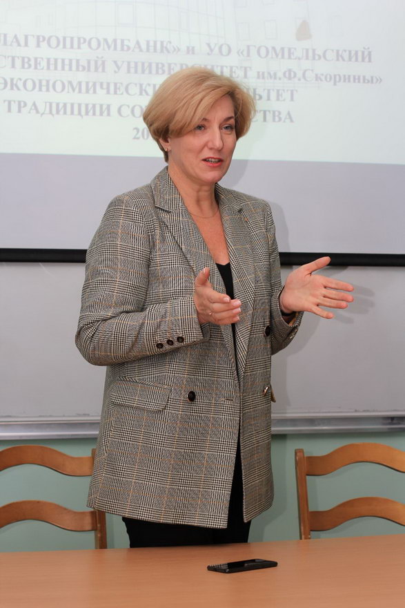 22 ноября в рамках мероприятий, посвященных 50-летию экономического факультета, состоялась мотивационная встреча с участием начальника отдела управления человеческими ресурсами Региональной дирекции по Гомельской области ОАО «Белагропромбанк» Инной Анатольевной Кострицей. Инна Анатольевна рассказала о возможностях построения успешной профессиональной карьеры в банковской сфере, о современных требованиях к компетенциям и личностным качествам специалистов банковского профиля.