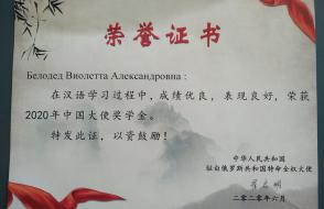 Среди 42 китаистов награды была удостоена выпускница филологического факультета 2020 года Виолетта Белодед.