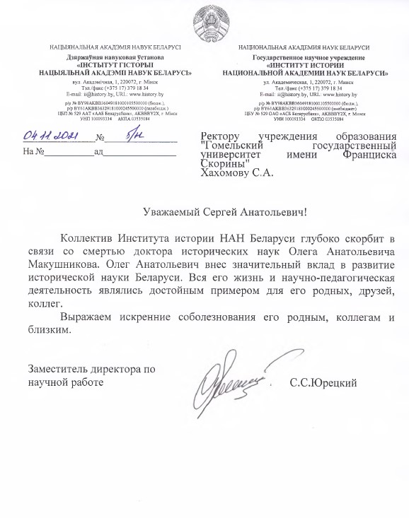 4 лістапада 2021 года на 62-м годзе жыцця спынілася сэрца Алега Анатольевіча Макушнікава, вядомага беларускага археолага, гісторыка, доктара гістарычных навук, прафесара кафедры філасофіі і спецыяльных гістарычных дысцыплін Гомельскага дзяржаўнага ўніверсітэта імя Ф. Скарыны.