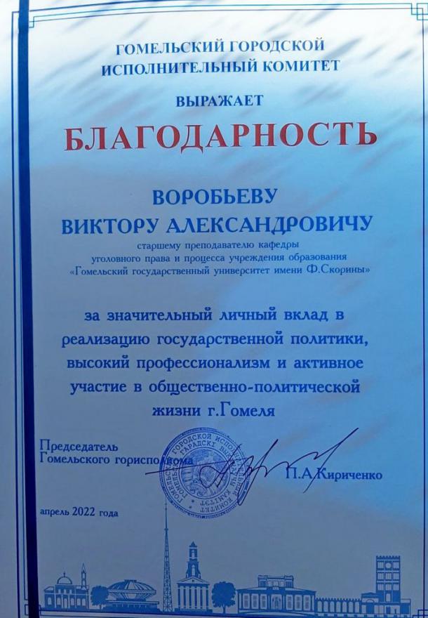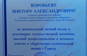 Среди награжденных – старший преподаватель кафедры уголовного права и процесса Виктор Воробьев. Виктору Александровичу объявлена Благодарность от Гомельского горисполкома за значительный личный вклад в реализацию государственной политики, высокий профессионализм и активное участие в общественно-политической жизни г. Гомеля.