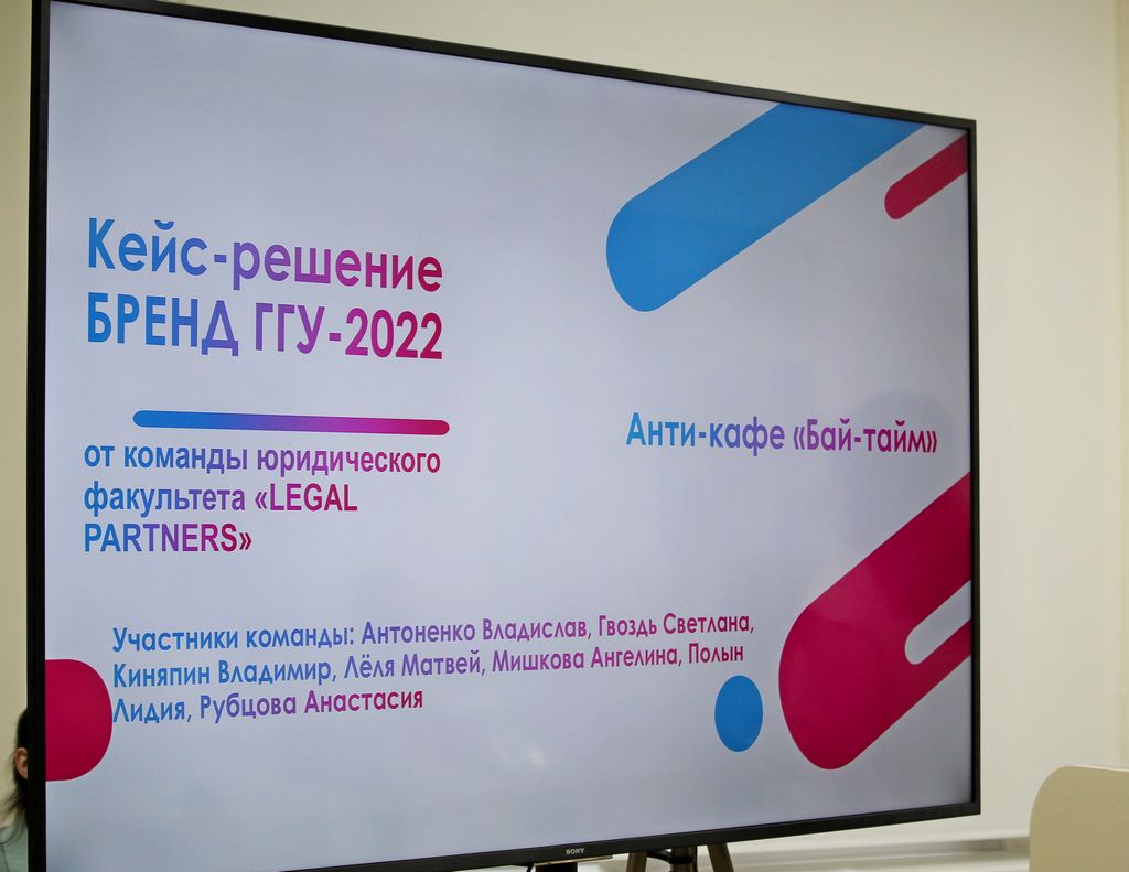 Самая многочисленная команда юридического факультета «Legal partners» (Ангелина Мишкова, Владислав Антоненко, Матвей Лёля, Владимир Киняпин, Лидия Полын, Анастасия Рубцова, Светлана Гвоздь, руководитель команды – Елена Ивановна Усова) предложила решение проблемы организации свободного времени молодежи г. Гомеля, досуга студентов на платной основе. Ребята презентовали кейс-решение открытия антикафе «Бай-тайм» на свободных площадях университета с возможностью частичной занятости студентов в роли аниматоров и администраторов, а также использованием кулинарной продукции столовой нашего университета.