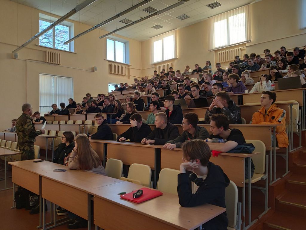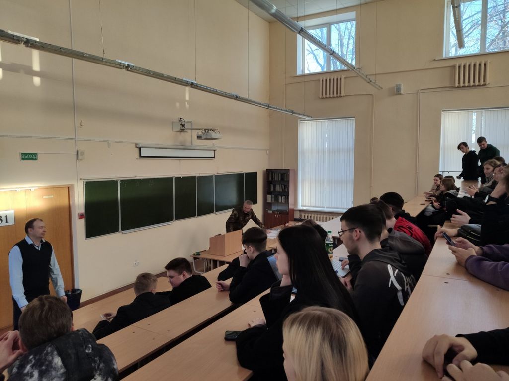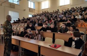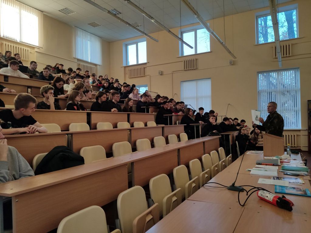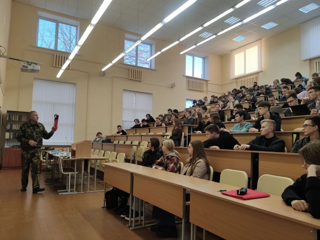 Евгений Борисович рассказал о правилах поведения в чрезвычайных ситуациях, особое внимание уделил вопросам поведения на пожарах. Студентам было рассказано о средствах пожарной безопасности: извещателях, сигналах пожарной тревоги, правилах применения огнетушителей. Особое внимание было уделено порядку эвакуации из здания при пожаре и недопущению паники. Студенты принимали активное участие в обсуждении поставленных проблем, задавали вопросы по теме мероприятия. Была также разыграна внештатная ситуация – «возгорание в корпусе». Была проведена срочная эвакуация студентов из корпуса, с которой студенты успешно справились, полностью уложившись в нормативы.