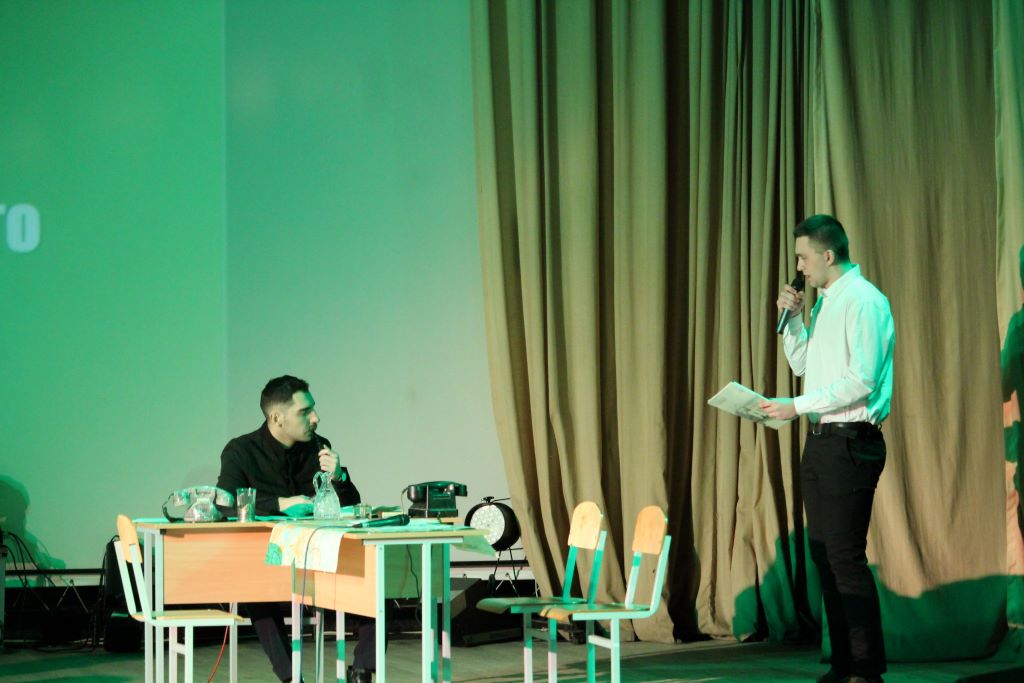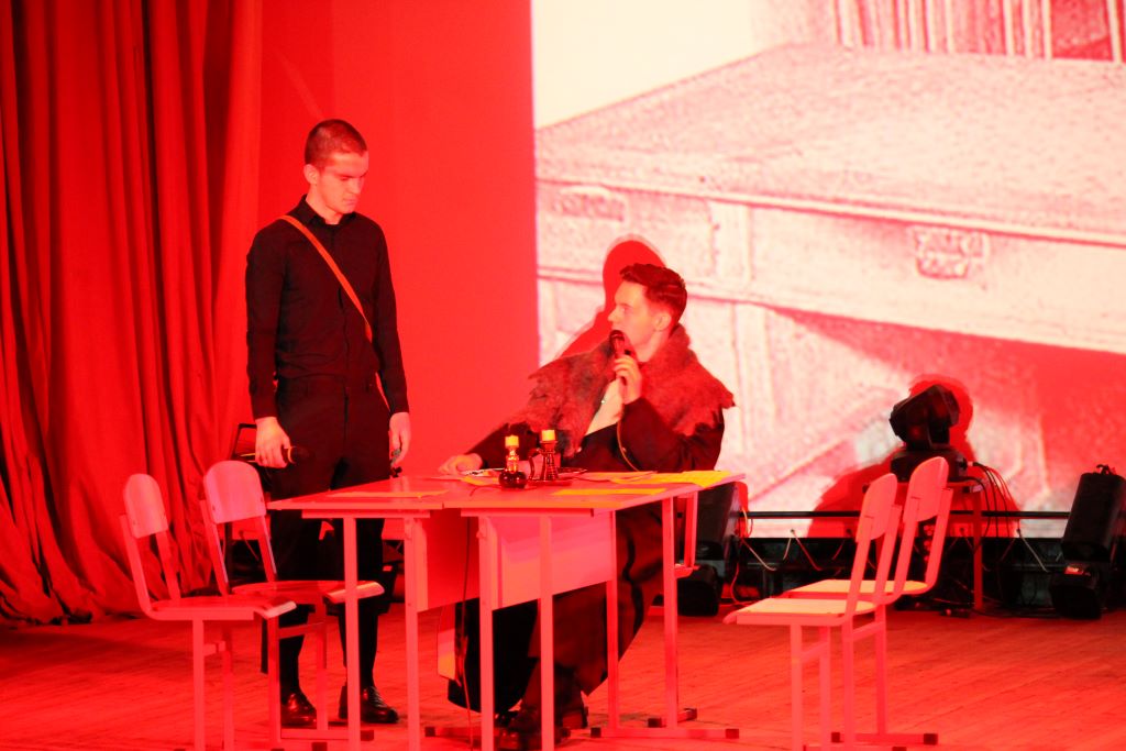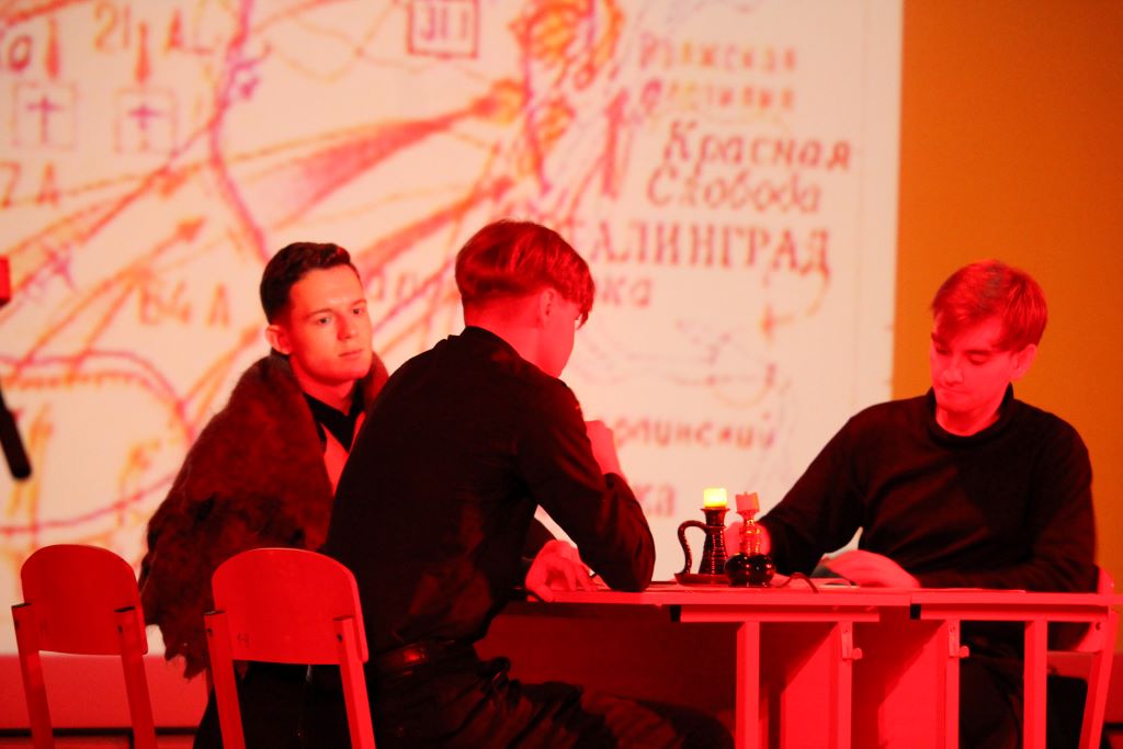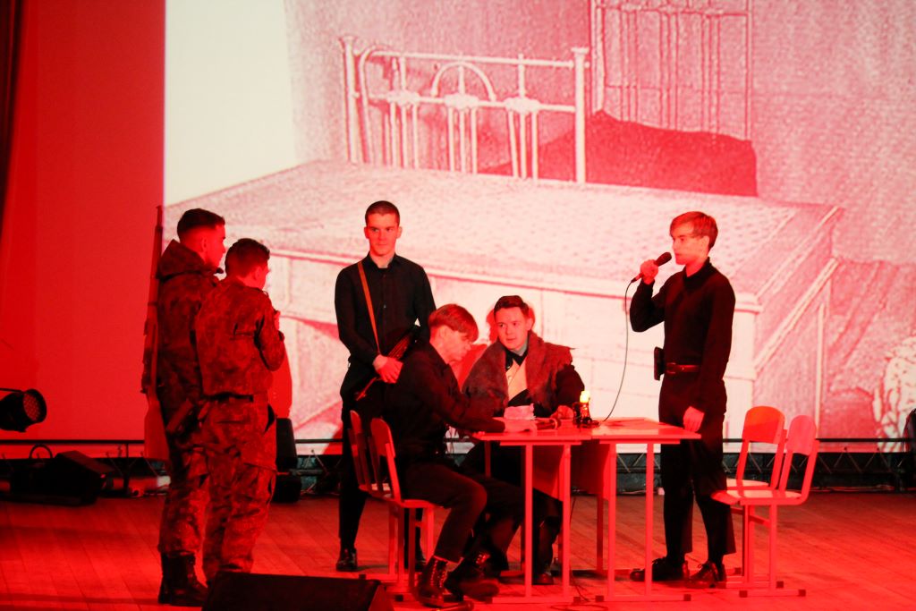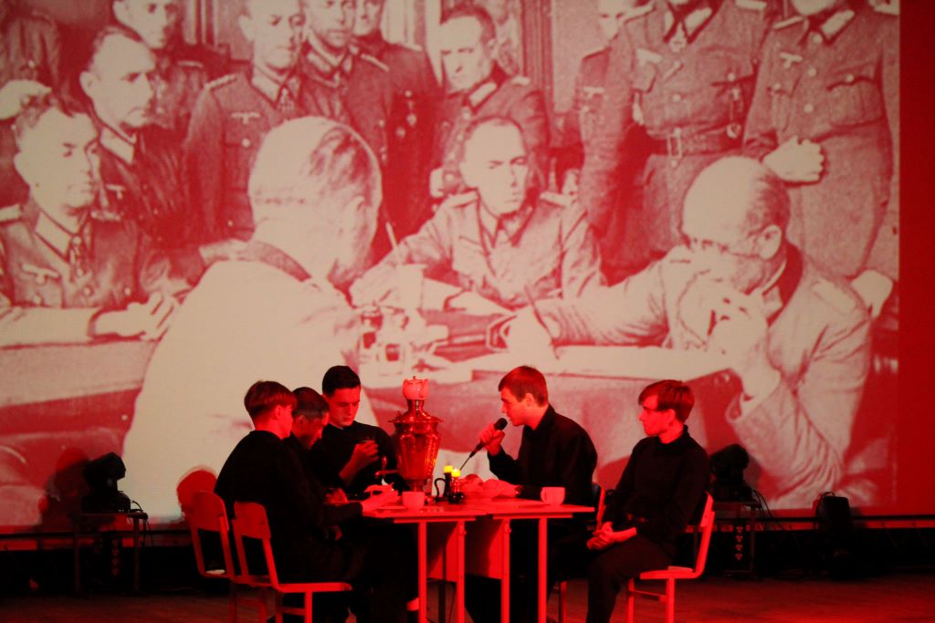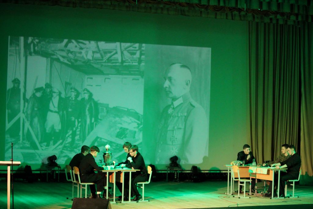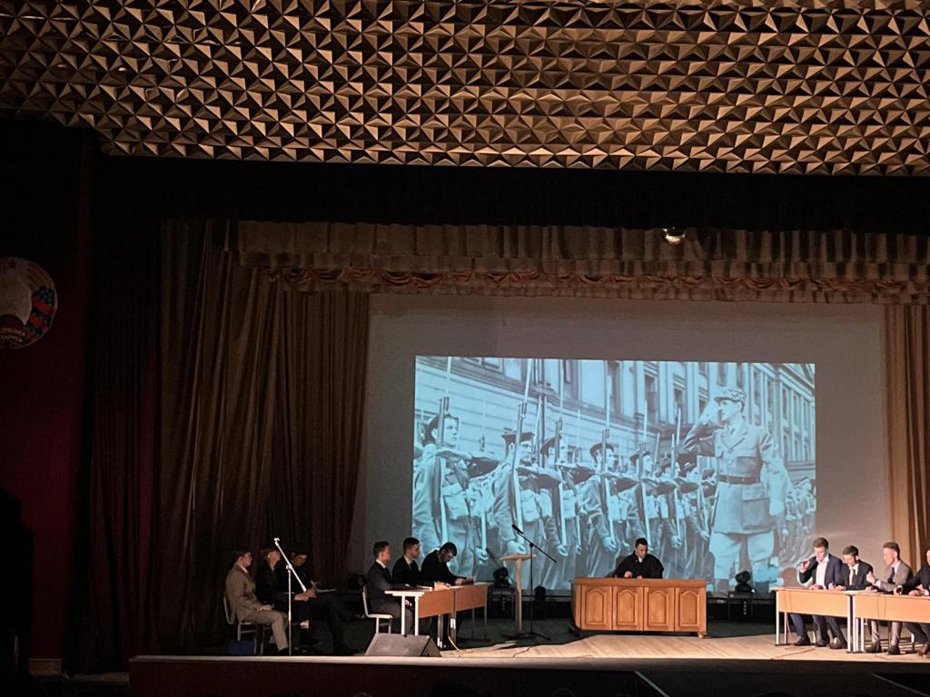 На сцене актового зала ГГУ имени Ф. Скорины студенты переводческого факультета и факультета немецкого языка МГЛУ воссоздают реальную историю значимых исторических событий с использованием немецкого языка и синхронного перевода с использованием аутентичных фотоматериалов и артефактов того времени.