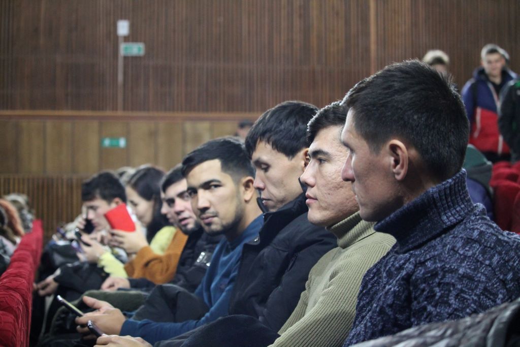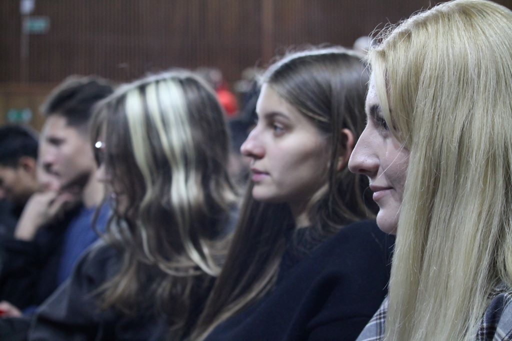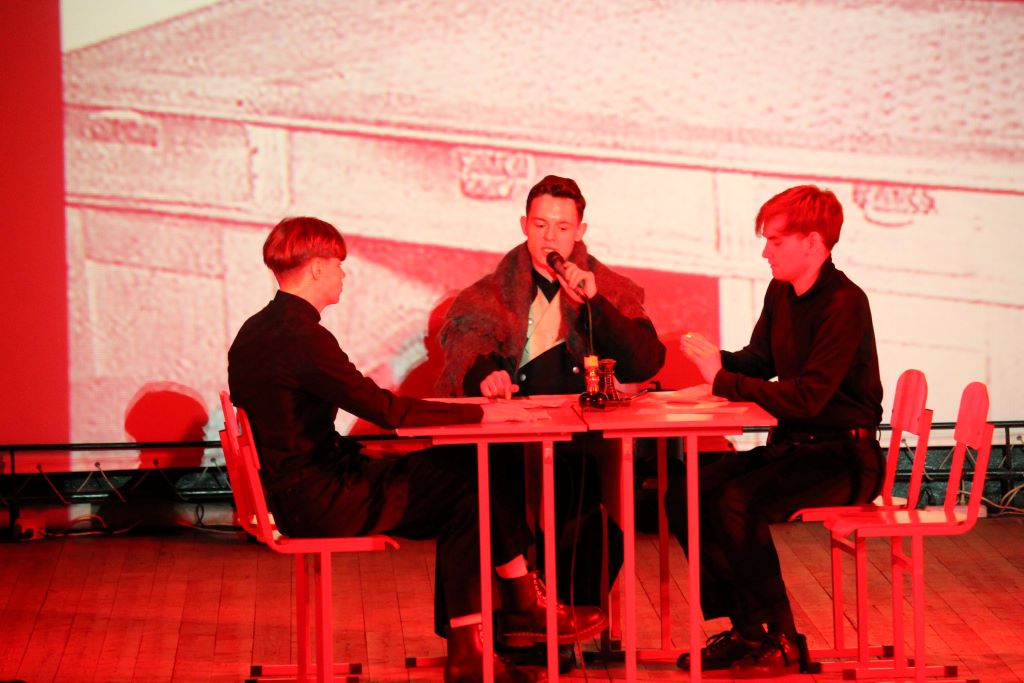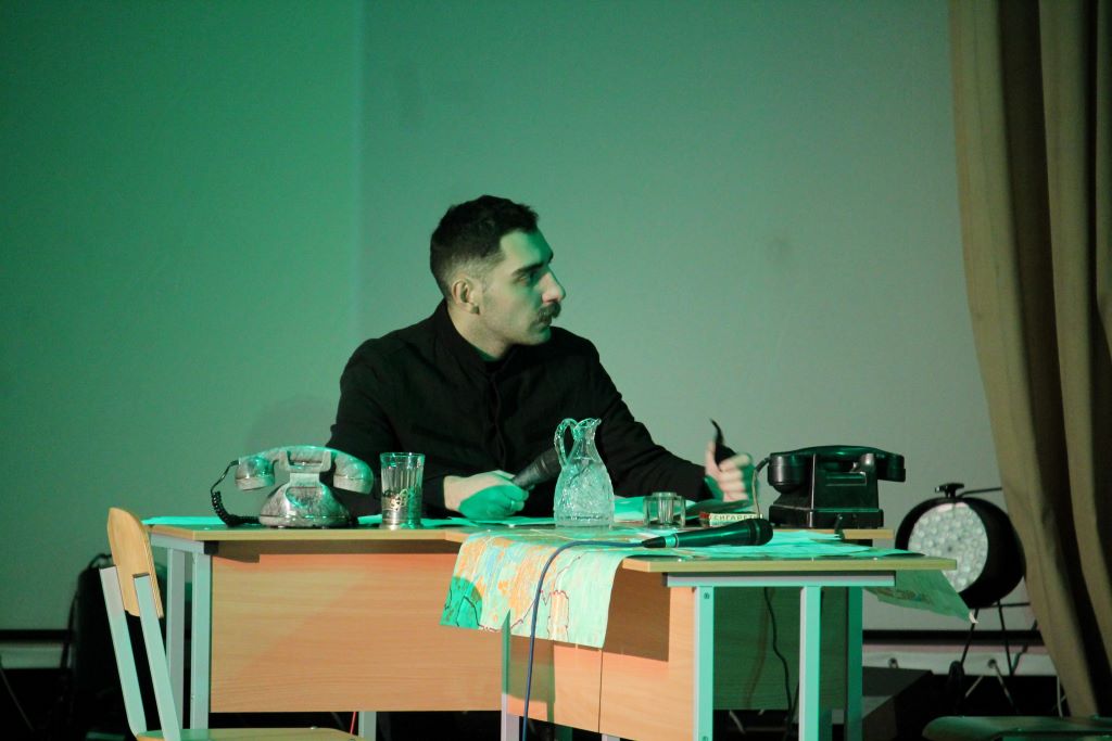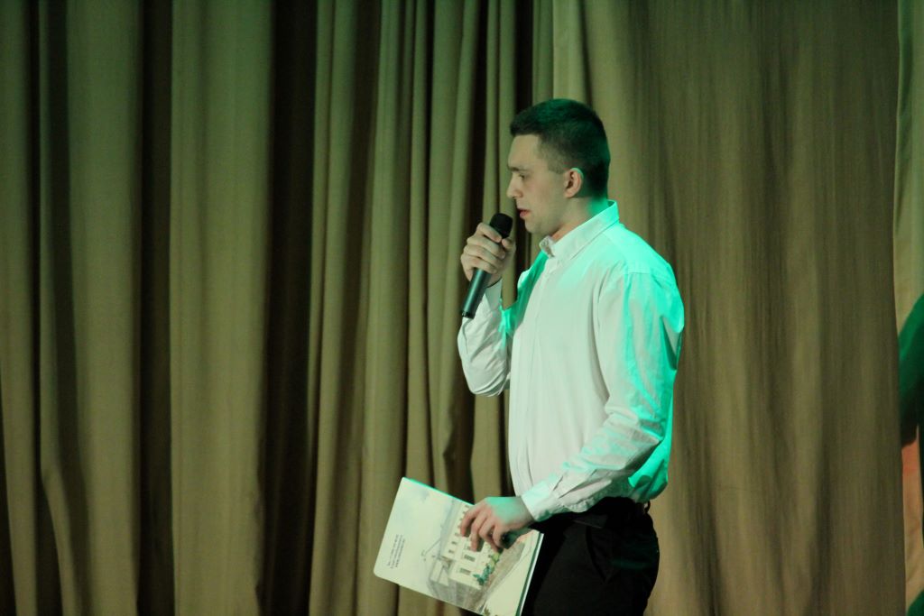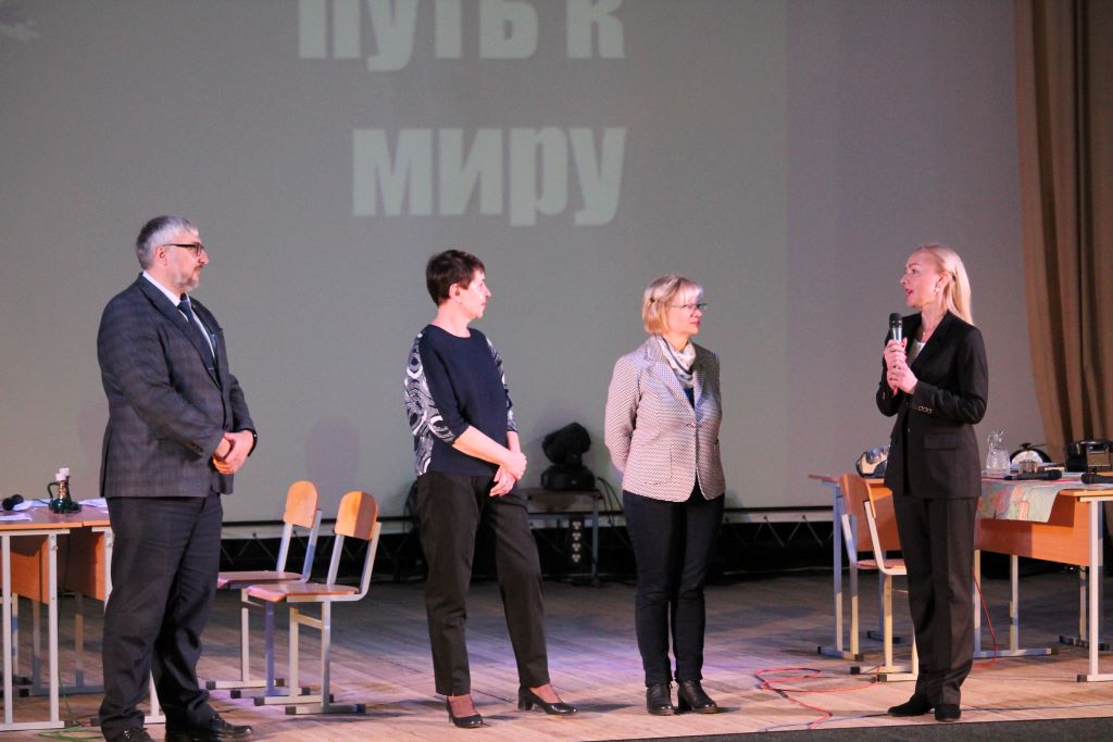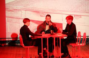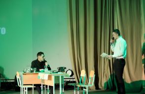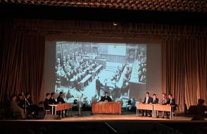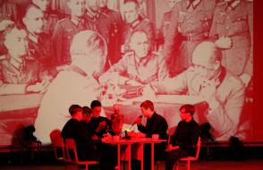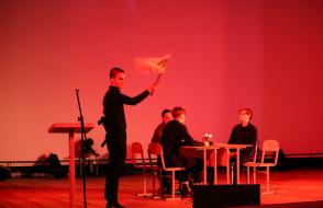 На сцене актового зала ГГУ имени Ф. Скорины студенты переводческого факультета и факультета немецкого языка МГЛУ воссоздают реальную историю значимых исторических событий с использованием немецкого языка и синхронного перевода с использованием аутентичных фотоматериалов и артефактов того времени.