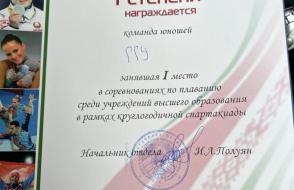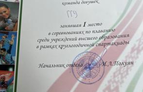 Команда девушек ГГУ оказалась сильнейшей и заняла I место! Нашим пловчихам уступили соперницы из Гомельского государственного медицинского университета (II место) и Белорусского государственного университета транспорта (III место).