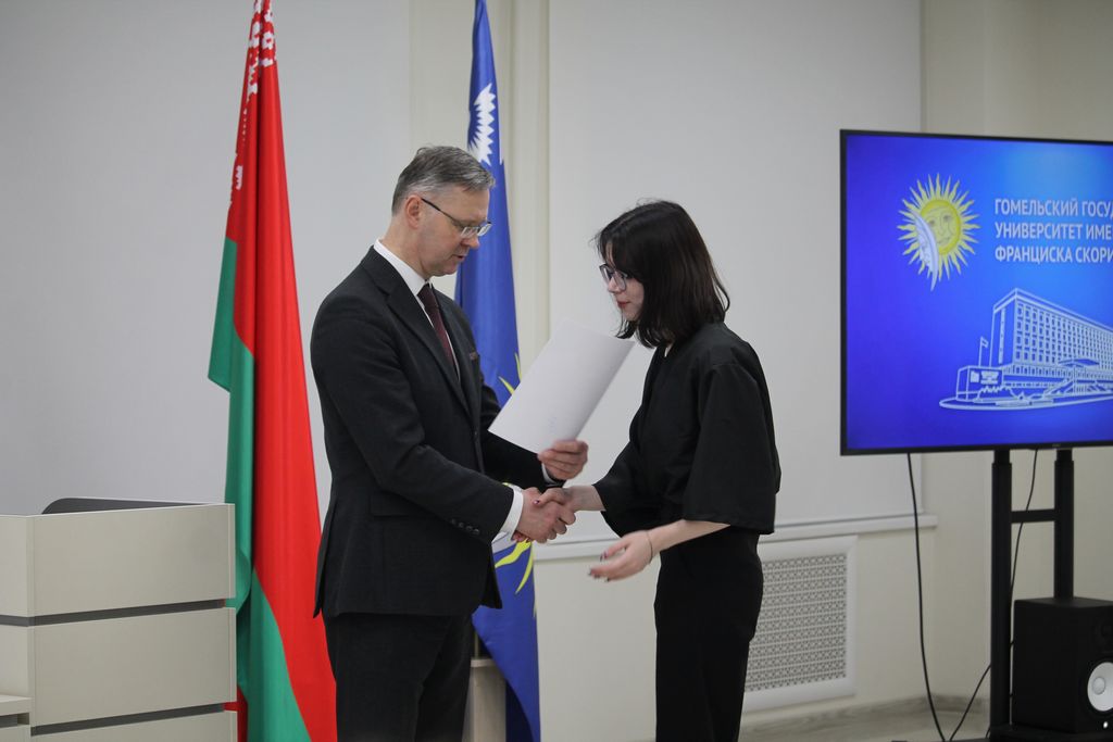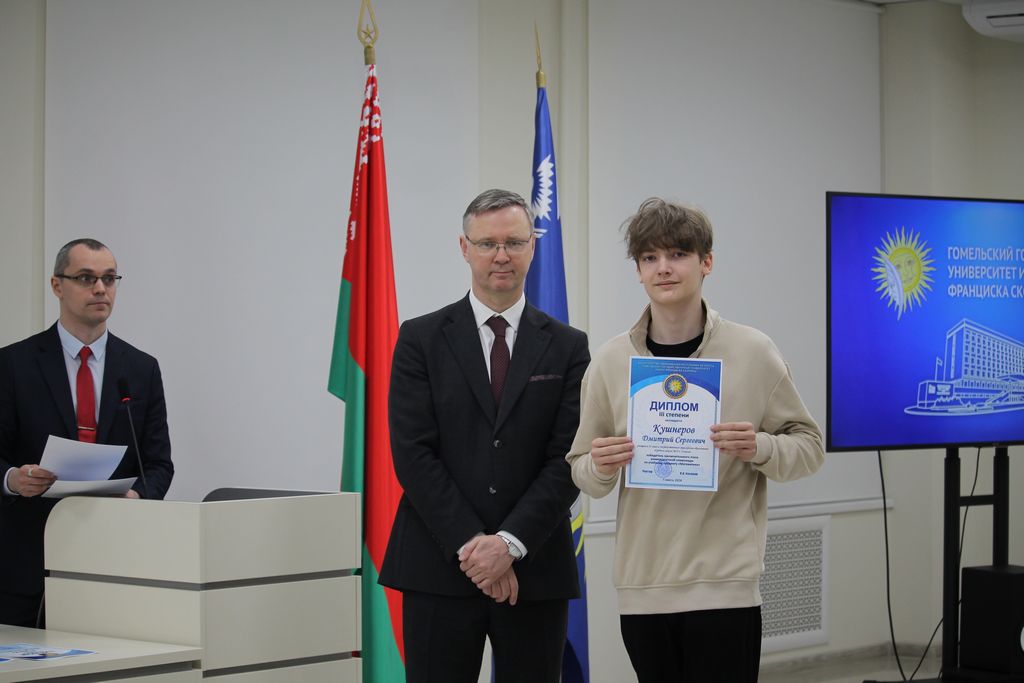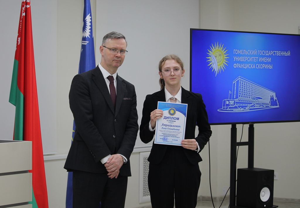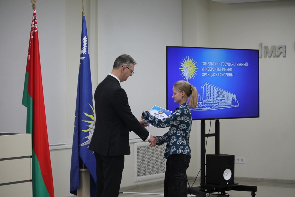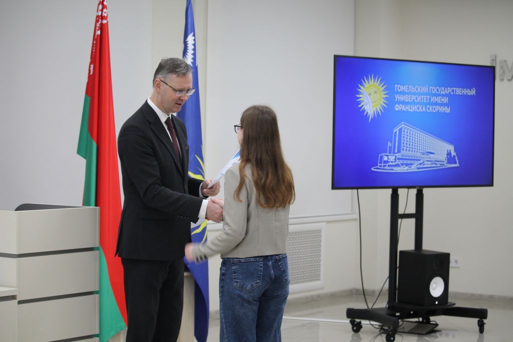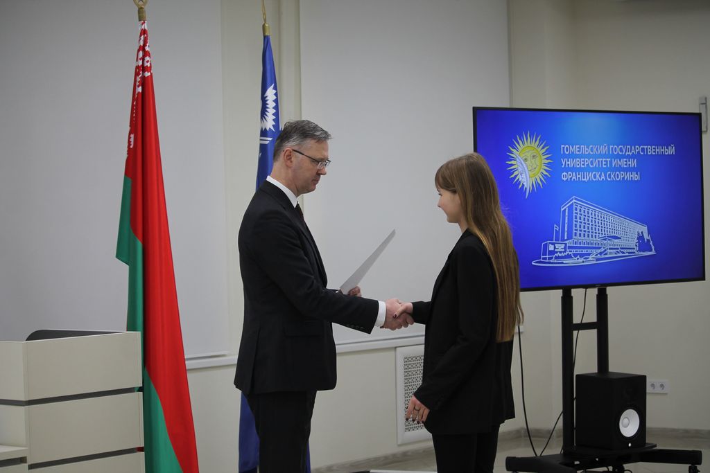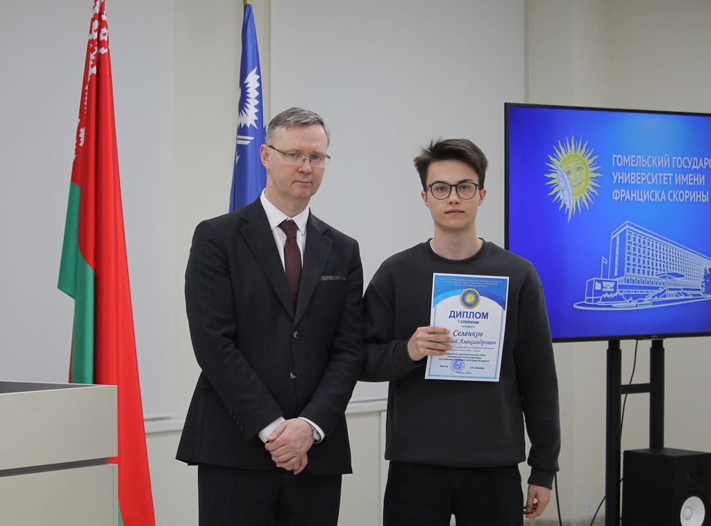В Гомельском государственном университете имени Франциска Скорины состоялось торжественное награждение победителей университетских олимпиад по различным предметам. Ректор университета Сергей Хахомов вручил дипломы учащимся 11 классов, которые показали выдающиеся знания и умения в таких областях, как математика, биология, иностранные языки и другие. Победителями заключительного этапа университетской олимпиады стали 84 учащихся. Данная категория абитуриентов будет зачислена без экзаменов в рамках квоты, утверждённой Министерством образования Республики Беларусь. Также представители университета встретились с учащимися 11 классов учреждений общего среднего образования, претендующих на получение аттестатов особого образца с награждением золотой или серебряной медали. Согласно Указа Президента Республики Беларусь №416 от 29 декабря 2023 года данная категория абитуриентов может быть зачислена в наш университет без экзаменов на все специальности, за исключением специальностей: "Правоведение", "Экономическое право", "Журналистика" и "Тренерская деятельность", в рамках 80 процентов от контрольных цифр приема на бюджет.