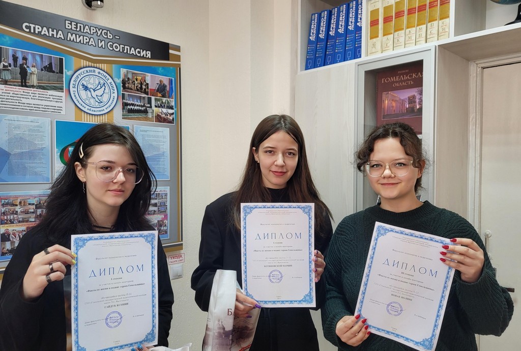 Среди студентов университета дипломами первой степени удостоены студентки факультета психологии и педагогики - Щетько Анастасия (Пс-12), Исаченко Анастасия (Пс-12) и Телепнева Елена (Ср-45), получившие практически максимальное количество баллов. Второе место - у студента биологического факультета Будяну Ивана (Би-11), на третьем - будущий психолог Сувалова Анна (Пс-31). Среди участников из числа обучающихся первое место разделили Ксения Гайдук и Хотяновская Марина - учащиеся группы П-22 ГУО «Гомельский государственный педагогический колледж имени Л.С. Выготского». На втором месте – Роман Романьков, учащийся группы ТОС-31 УО «Гомельский государственный машиностроительный колледж». Одиннадцатиклассница ГУО «Средняя школа № 2 г. Ельска» Татьяна Домнич и обучающаяся группы П-22 ГУО «Гомельский государственный педагогический колледж имени Л.С. Выготского» Полина Новак отмечены дипломами третьей степени.