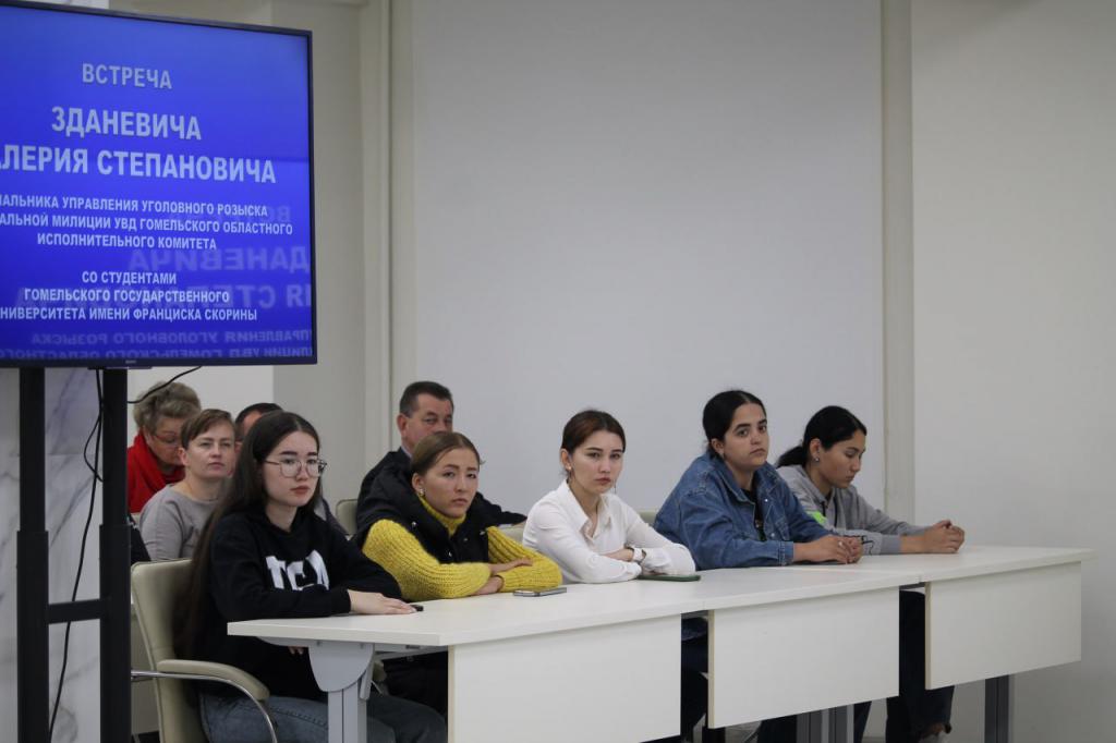 В Гомельском государственном университете имени Франциска Скорины прошла встреча начальника управления уголовного розыска криминальное милиции УВД Гомельского облисполкома Валерия Зданевича со студентами университета. Валерий Степанович кратко охарактеризовал криминальную ситуацию в городе Гомеле и Гомельской области. Подробно остановился на вопросах информационной безопасности. Кроме этого, Валерий Степанович рассказал о критериях отбора выпускников уво для работы в органах УВД, должностях, предоставляемых льготах и пригласил студентов по окончании учебы поступать на работу в подразделения УВД. В заключительной части встречи Валерий Степанович ответил на вопросы присутствующих.