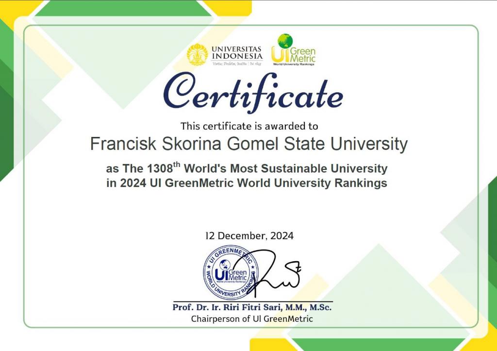 В 2024 году Гомельский государственный университет имени Франциска Скорины впервые принял участие в международном экологическом рейтинге университетов UI GreenMetric World University Rankings. Университет занял 1308-е место среди 1477 участников со всего мира и 7-е место среди высших учебных заведений Республики Беларусь. Это значимое событие, подчеркивающее стремление университета к внедрению устойчивых технологий и продвижению экологического подхода в образовательной и научной деятельности.