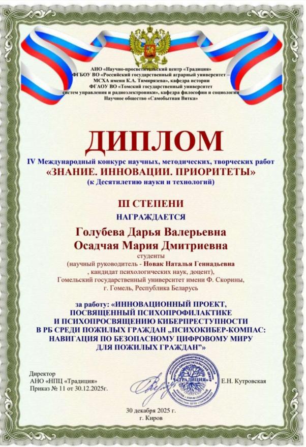 Подведены итоги IV Международного конкурса научных, методических, творческих работ «ЗНАНИЕ. ИННОВАЦИИ. ПРИОРИТЕТЫ», который проходил в онлайн-формате 30 декабря (г. Киров, РФ).