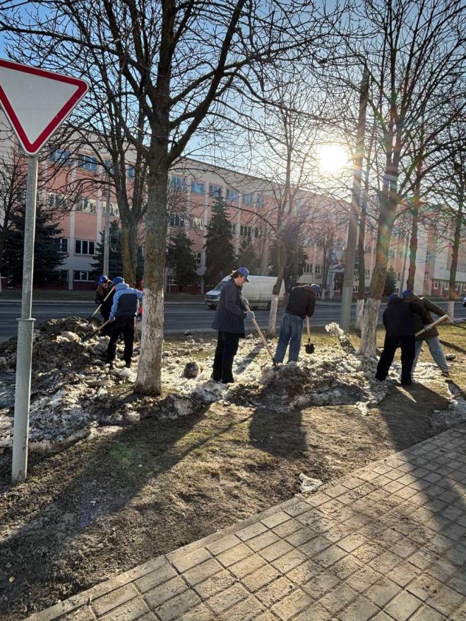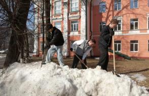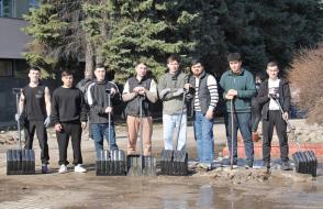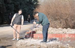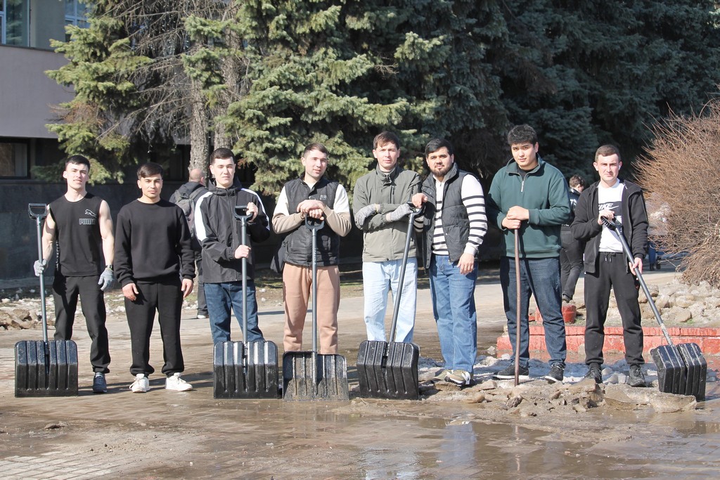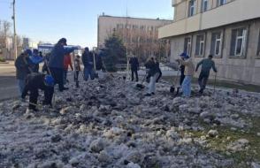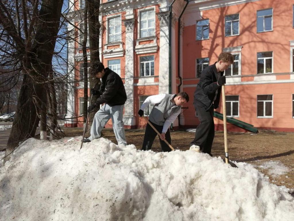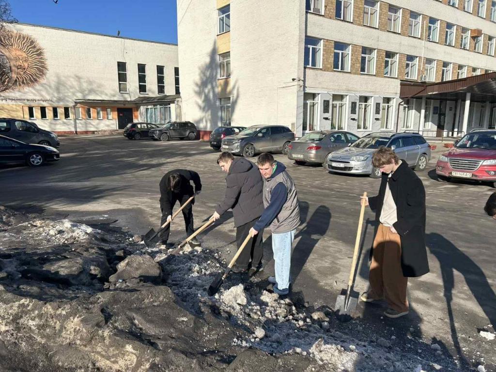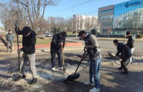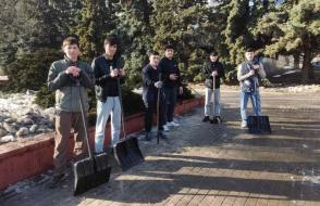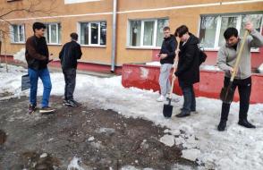 Вооружившись лопатами и хорошим настроением, преподаватели, студенты и сотрудники сообща очистили территории вокруг корпусов и общежитий от снега и наледи.