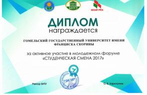 С 16 по 21 ноября 2017 года Белорусским национальным техническим университетом совместно с Республиканским общественным объединением «Белая Русь» при поддержке Министерства образования Республики Беларусь на базе санатория-профилактория БНТУ «Политехник» (Минский р-н, д. Приморье) для актива студенческой молодежи учреждений высшего образования Республики Беларусь был организован и проведен Межвузовский молодежный форум «Студенческая смена – 2017».