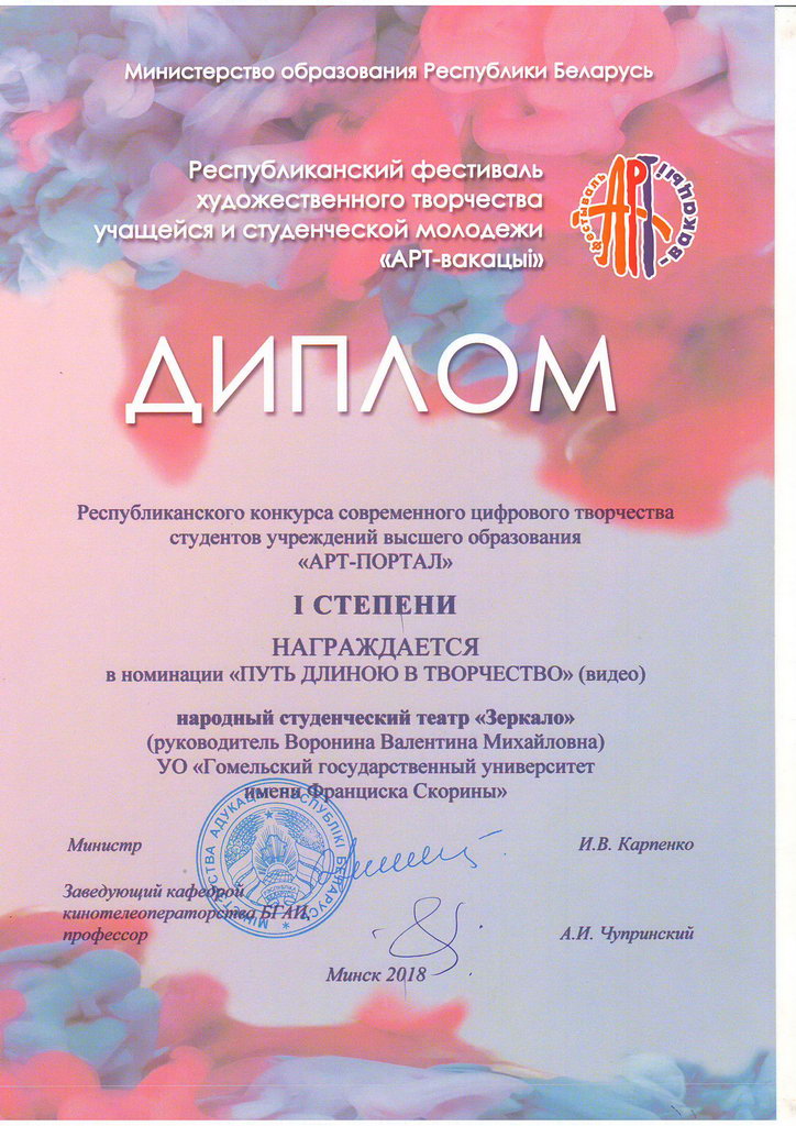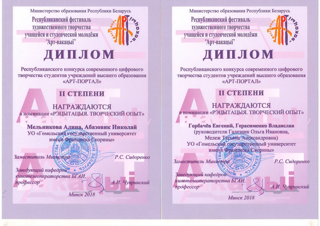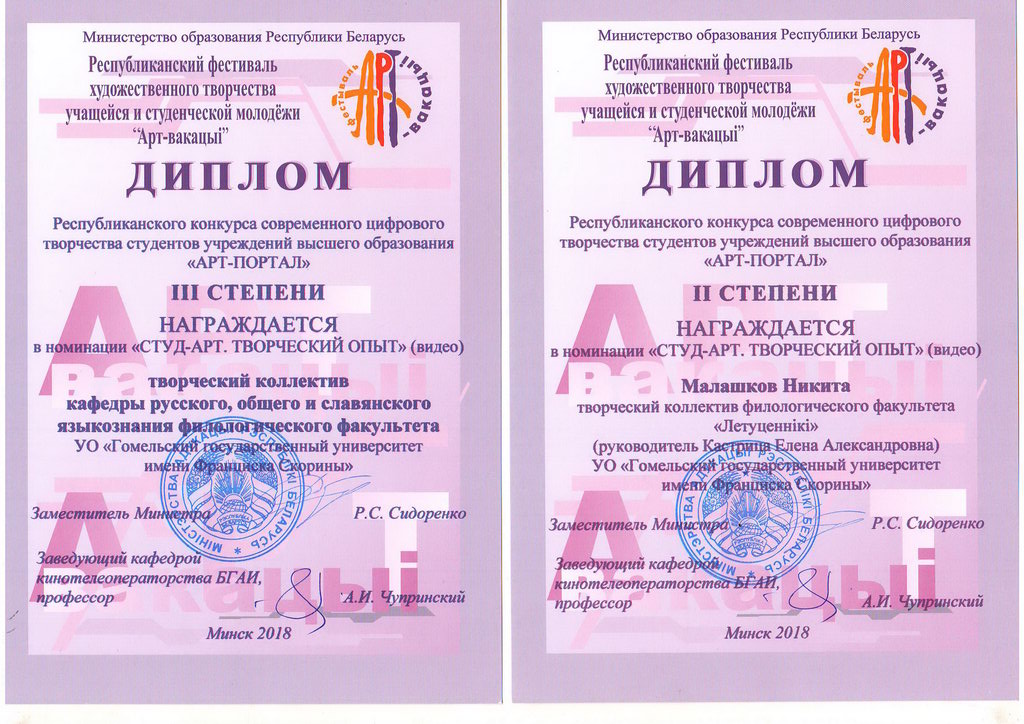 По итогам республиканского конкурса художественного творчества учащихся и студенческой молодежи «АРТ-вакацыі-2018» творческие коллективы и студенты ГГУ имени Ф. Скорины были награждены дипломами различной степени.