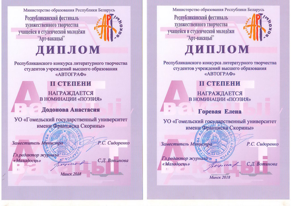 Додонова Анастасия (конкурс литературного творчества студентов учреждений высшего образования «Автограф», номинация «Поэзия»);