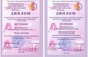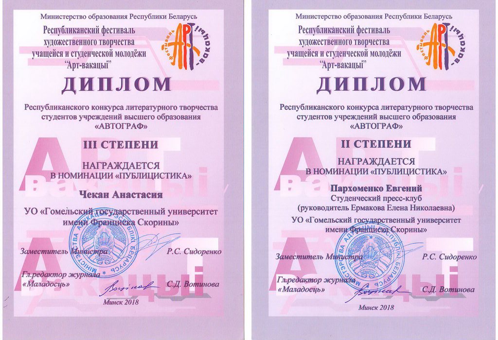 Пархоменко Евгений, студенческий пресс-клуб, руководитель Ермакова Елена Николаевна (конкурс литературного творчества студентов учреждений высшего образования «Автограф», номинация «Публицистика»);