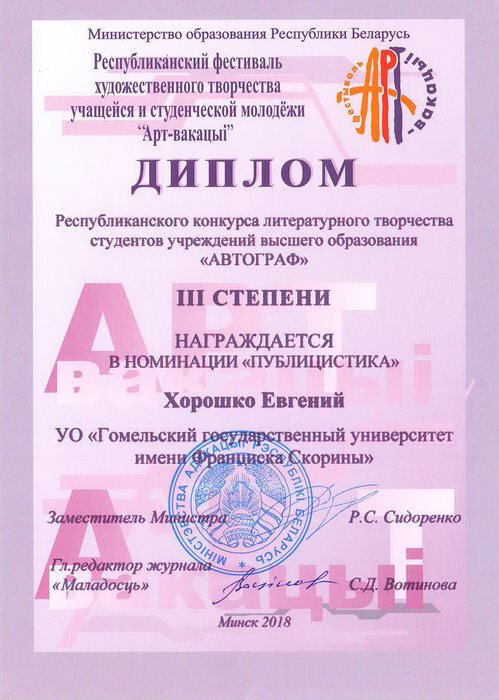Хорошко Евгений (конкурс литературного творчества студентов учреждений высшего образования «Автограф», номинация «Публицистика»);