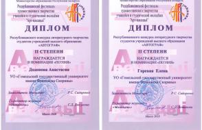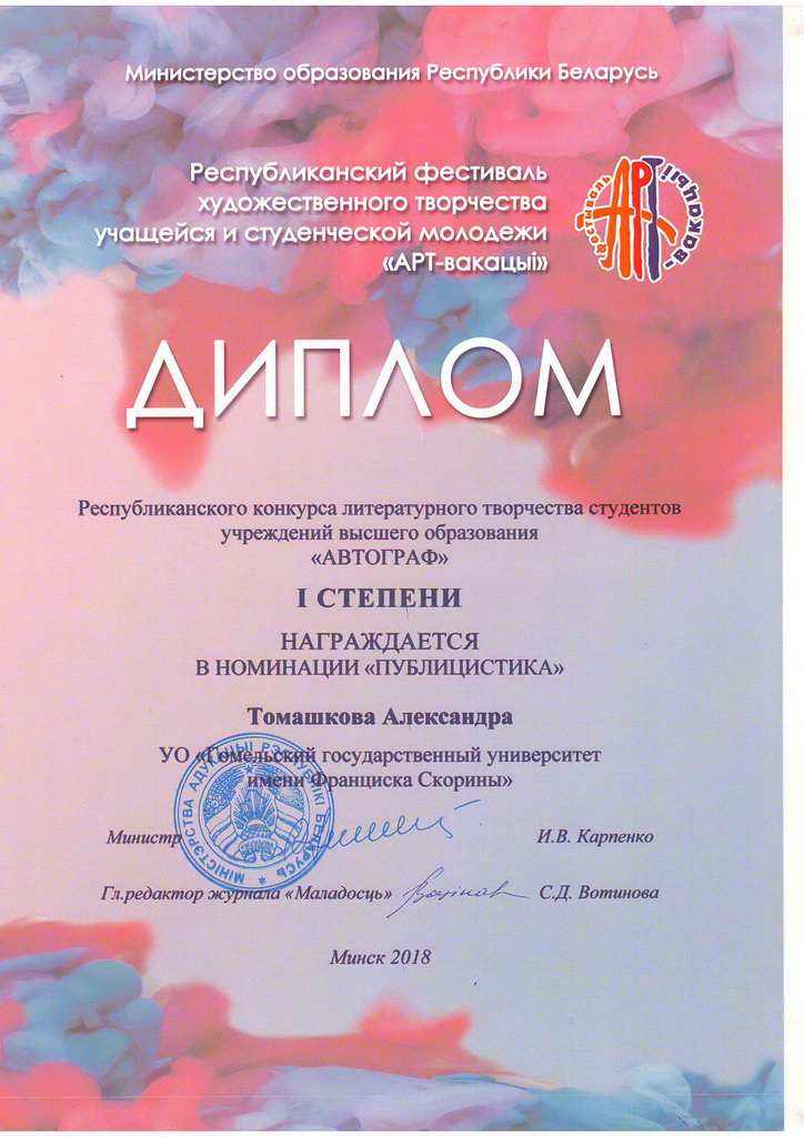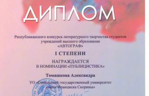 Томашкова Александра (конкурс литературного творчества студентов учреждений высшего образования «Автограф», номинация «Публицистика»);