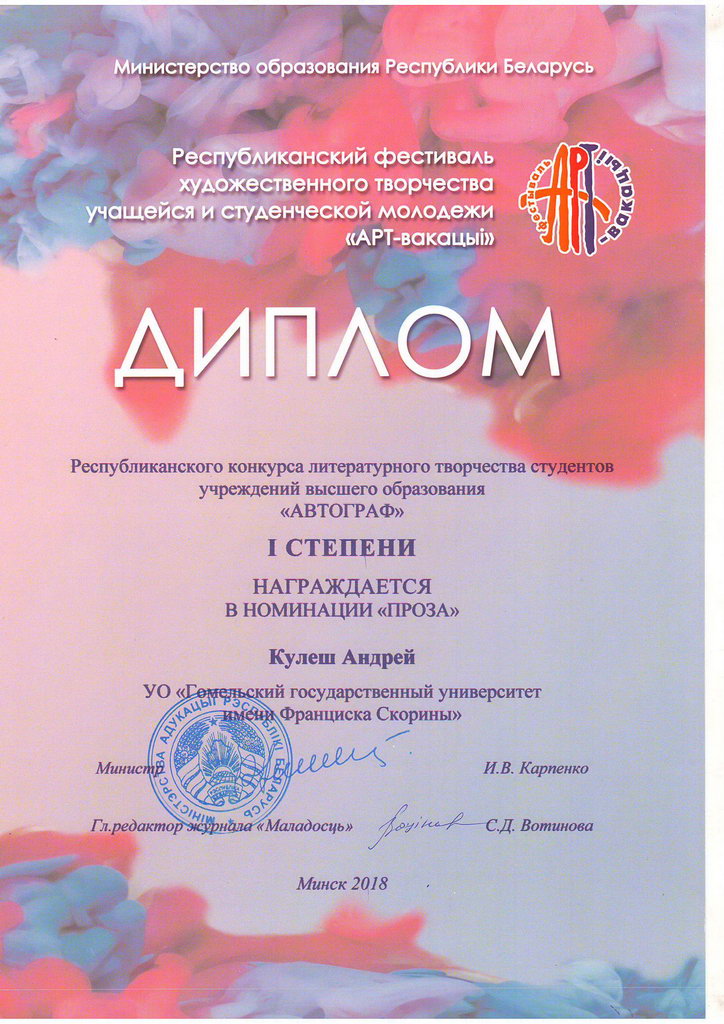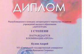 Кулеш Андрей (конкурс литературного творчества студентов учреждений высшего образования «Автограф», номинация «Проза»).