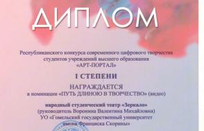 коллектив народного студенческого театра «Зеркало», руководитель Воронина Валентина Михайловна (конкурс «Современное цифровое творчество «Арт-портал», номинация «Путь длиною в творчество»);
