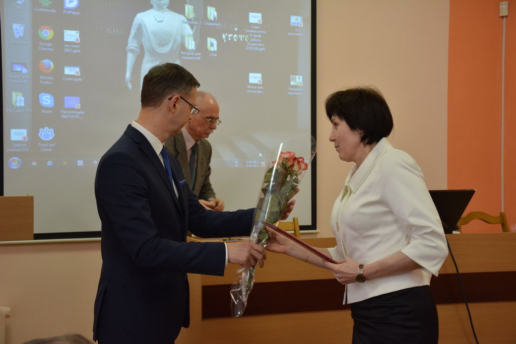 Нагрудные знаки Министерства образования Республики Беларусь «Отличник образования» за многолетнюю плодотворную научно-педагогическую работу, значительный вклад в усовершенствование образовательного процесса в университете и подготовку высококвалифицированных специалистов были вручены на Совете университета доктору физико-математических наук, профессору Юрию Владимиру Малинковскому и доктору исторических наук, профессору Григорию Григорьевичу Лозько. Почетными грамотами университета были награждены пятеро преподавателей нашего вуза.