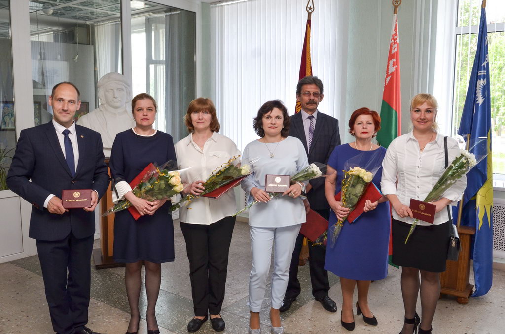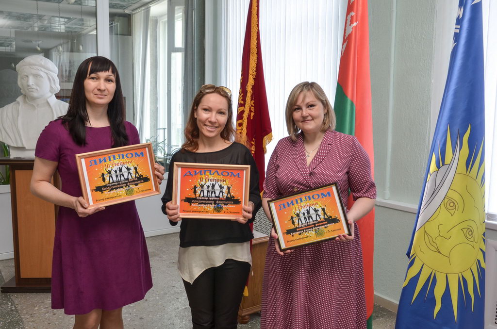 Дипломы 1-й, 2-й и 3-й степеней соответственно за победу в вузовском конкурсе на лучшую учебную группу получили кураторы трех студенческих коллективов – доцент кафедры белорусской культуры и фольклористики Елена Кострица (группа РФ-31), старший преподаватель кафедры теории и истории государства и права Елена Караваева (группа П-32) и доцент кафедры ботаники и физиологии растений Юлия Бачура (группа БИ-41).