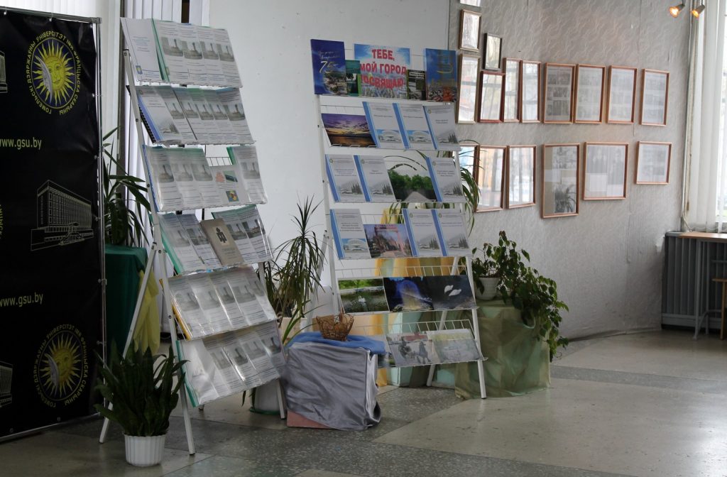 Экспозиция выставки представила гостям выставочного зала историю культурного развития Гомельщины в разрезе развития гомельского университета, которому в следующем году исполнится 50 лет. Представленные экспонаты – это фотографии, статьи в различных печатных изданиях, книги, исторические документы, графические работы, которые презентовали студенты и преподаватели факультетов, самыми активными из которых стали исторический, филологический, геолого-географический, юридический факультеты, факультеты математики и технологии программирования и физики и информационных технологий.
