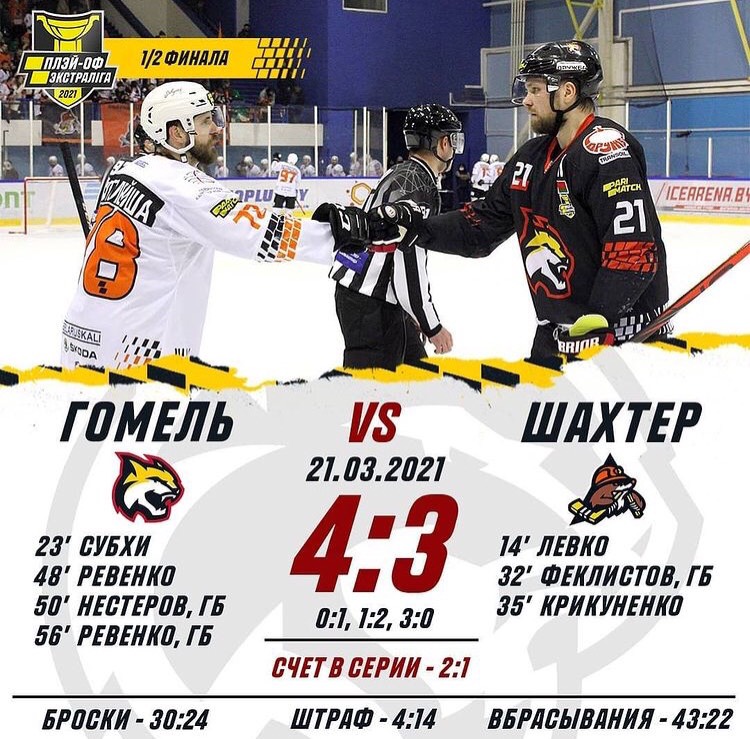 21 марта в третьем матче полуфинальной серии хоккейный клуб «Гомель» на домашнем льду принимал «Шахтера». Уступая по ходу матча со счетом 1:3, гомельчане совершили сумасшедший камбэк, сделав счет 3:3, после чего забросили четвертую шайбу в ворота «горняков».