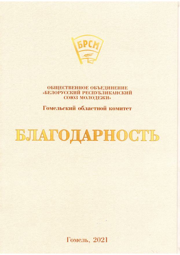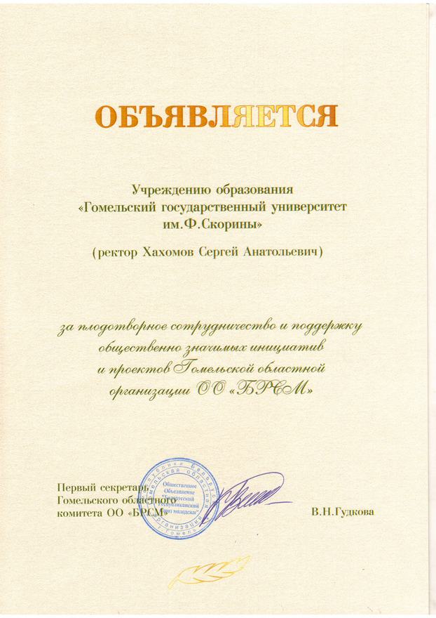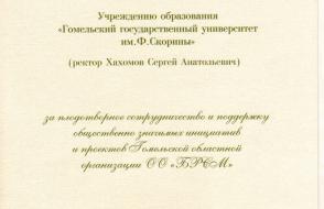 В завершение мероприятия заслуженные награды получили лучшие представители Союза молодежи Гомельщины и партнеры организации. За плодотворное сотрудничество и поддержку общественно значимых инициатив и проектов благодарность Гомельского областного комитета Белорусского республиканского союза молодежи объявлена и Гомельскому государственному университету имени Франциска Скорины.