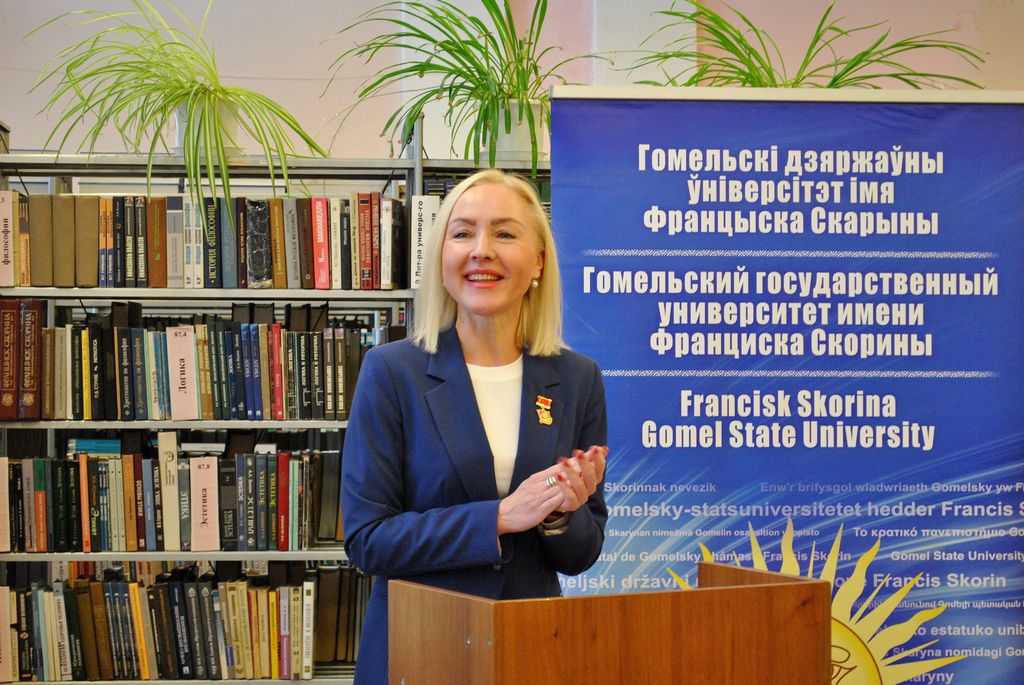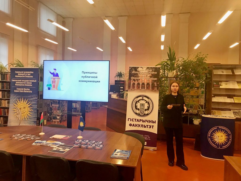 На торжественном открытии мероприятия заместитель декана по профориентационной работе Светлана Николаевна Рожкова представила образовательный потенциал факультета истории и межкультурных коммуникаций. Заведующий кафедрой МКК и МТ Татьяна Викторовна Починок рассказала школьникам о Гомельском государственном университете имени Франциска Скорины и направлениях развития кафедры.