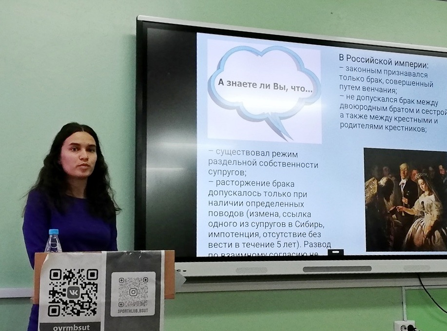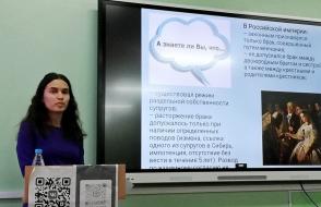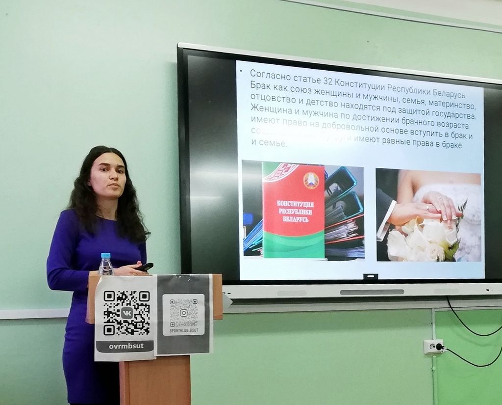 Надежда Вячеславовна представила доклад по теме «Институт брака по законодательству Республики Беларусь». Ее выступление было содержательным, научно обоснованным, изложение живым и вызвало интерес как у жюри, так и у аудитории. Она на высоком уровне осветила узловые вопросы, связанные с вступлением в брак, правами супругов и разводами, сопровождая выступление эффектной и логично выстроенной презентацией. Докладчик обоснованно сделала акцент на предысторию темы в исторической ретроспективе и обратила внимание на морально-этический сюжет проблемы, а также ситуацию, которая реально складывается в брачной сфере в Республике Беларусь на современном этапе.